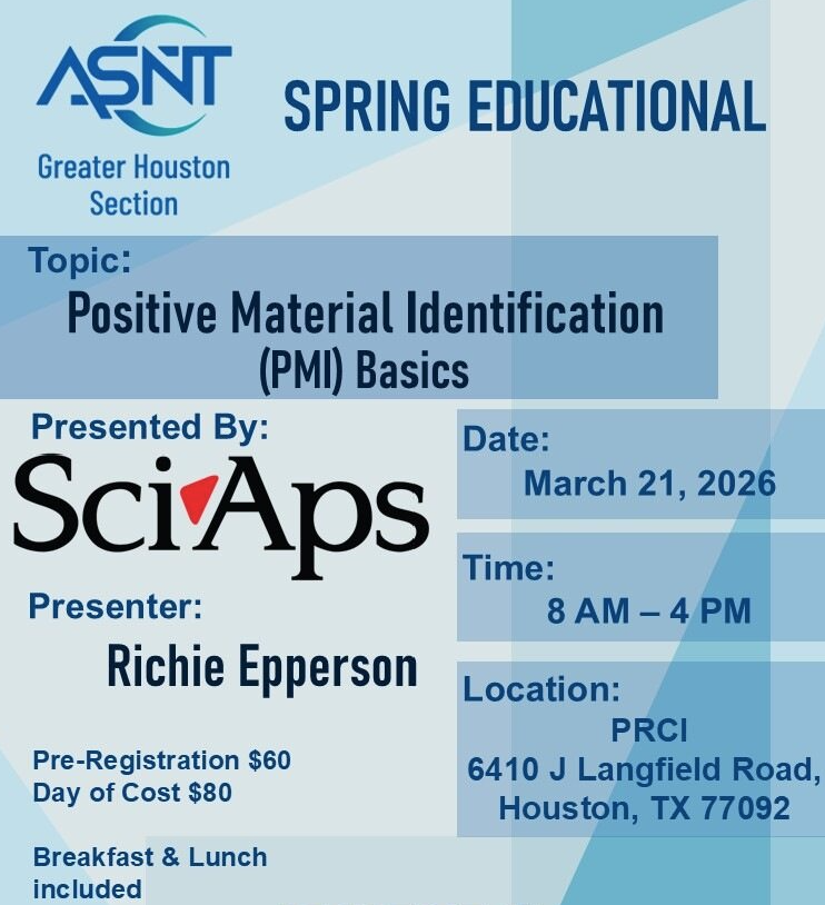Join the Greater Houston ASNT Section for our Spring Educational session focused on Positive Material Identification (PMI) Basics, presented by SciAps and instructor Richie Epperson.
